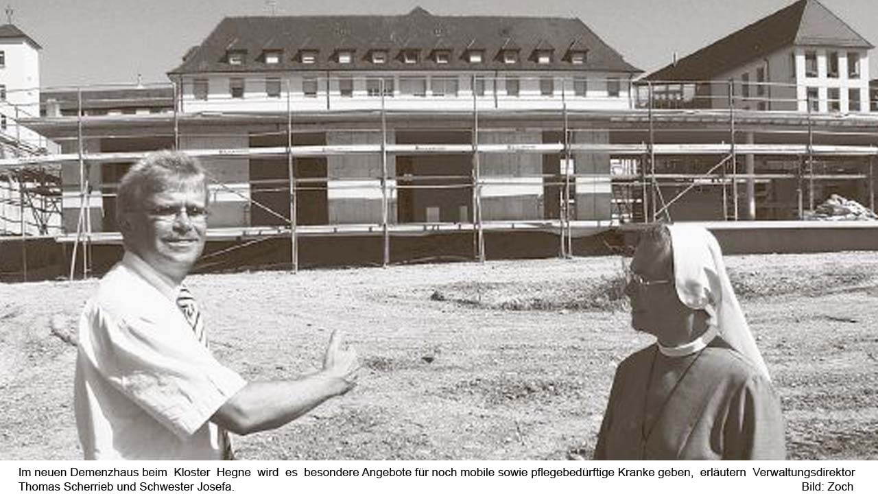 „Was Termine und Kosten betrifft, sind wir im Plan“, so Verwaltungsdirektor Thomas Scherrieb. Ein Problem habe es lediglich mit dem überraschend weichen Untergrund beim Demenzhaus gegeben, weshalb die Einrichtung nun nicht bereits Ende des Jahres, sondern im März 2006 eröffnet wird. Schon jetzt steht der flache Neubau in seinen künftigen Ausmaßen, die nicht die Sicht aufs Kloster behindern. Schwester Josefa, die Pressebeauftragte des Klosters, fügt an, es werden Anmeldungen angenommen.