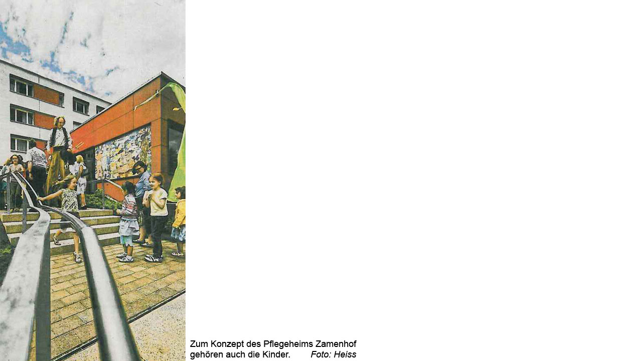 Zwei Jahre lang ist im Zamenhof seit dem Sanierungsbeschluss von 2007 gebaut worden, Doppelzimmer wurden zu Einzel­zimmern, das Pflegeheim bekam einen neuen Eingangsbereich, neue Funktions­- und Baderäume. Jetzt wird im Zamenhof mit seinen 108 Pflege­plätzen wieder gelebt. Die 62 zum Teil aus dem zur Wiedererrich­tung vorgesehenen Haus Hasenberg umge­zogenen Bewohner weihen die generalsa­nierte Anlage mit ei­nem Sommerfest ein. Kaffee und Kuchen, Kindergartenkinder und ein ökumeni­sches Segensgebet gehören dazu.