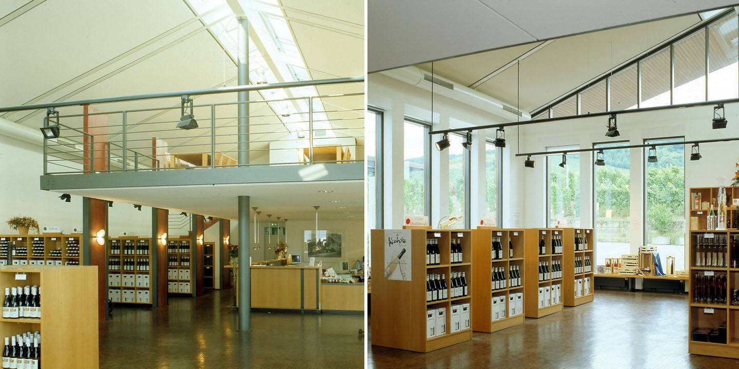 Innen wird die ehemalige Lagerhalle in ihrer vollen Höhe gezeigt und genutzt, um eine Galerie einzuziehen. Dies ergibt zusätzlichen Raum für Weinproben mit Blick auf den Kappelberg.