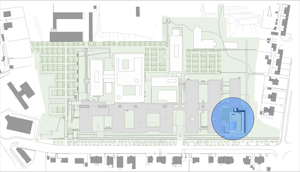 Ein eigener Bereich für Strahlentherapie ergänzt das Behandlungskonzept. Die Labore im dritten Obergeschoss dienen neben der täglichen medizinischen Versorgung besonders auch innovativen Forschungszwecken.