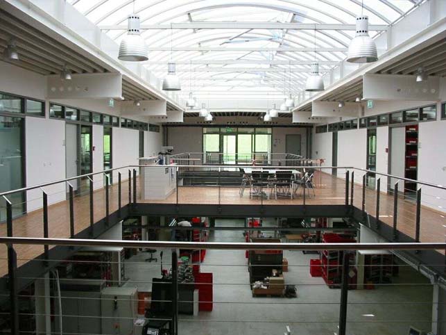 Der 2-geschossige Montagebereich setzt sich aus einer Halle mit Luftraum und Glasoberlicht mit Werkstattcharakter zusammen. Die Büroeinheiten wurden als Großraum geplant, kleine Leiterbüros sind abgetrennt. Im Montagebereich befindet sich eine Brücke über dem Luftraum, die als Pausenbereich mit genutzt werden kann.