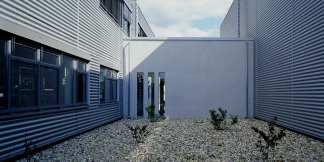 Der zweite Baukörper besteht aus einem 2-geschossigen Montage- und Entwicklungsbereich und einem 3-geschossigen Verwaltungsteil.