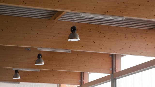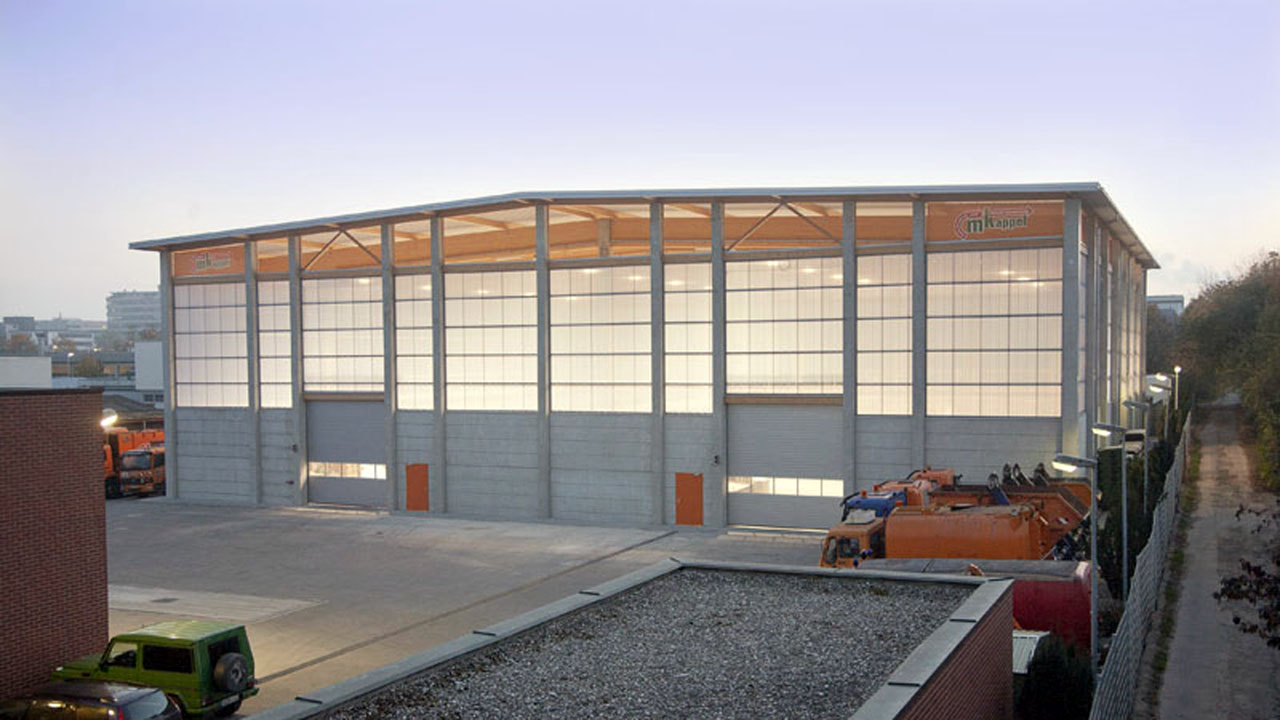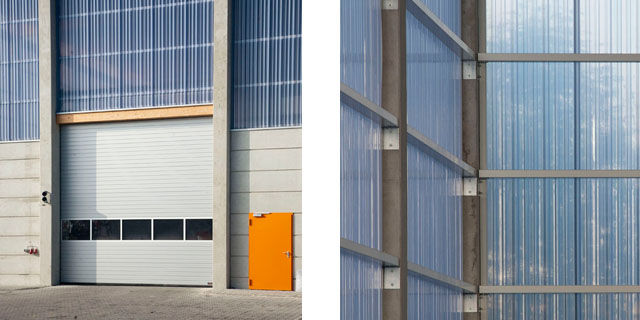 Als Außenwände wurden die Stahlbetonstützen bis zu einer Höhe von 4.50m mit Stahlbetonfertigteilen ausgefacht. Im Anschluss daran dienen zur Belichtung der Halle  profilierte Kunststoff-Lichtplatten. Die freie Belüftung wird durch offene Metallgitter im oberen Fassadenbereich gewährleistet.