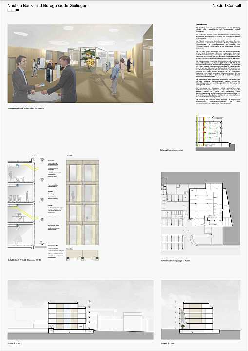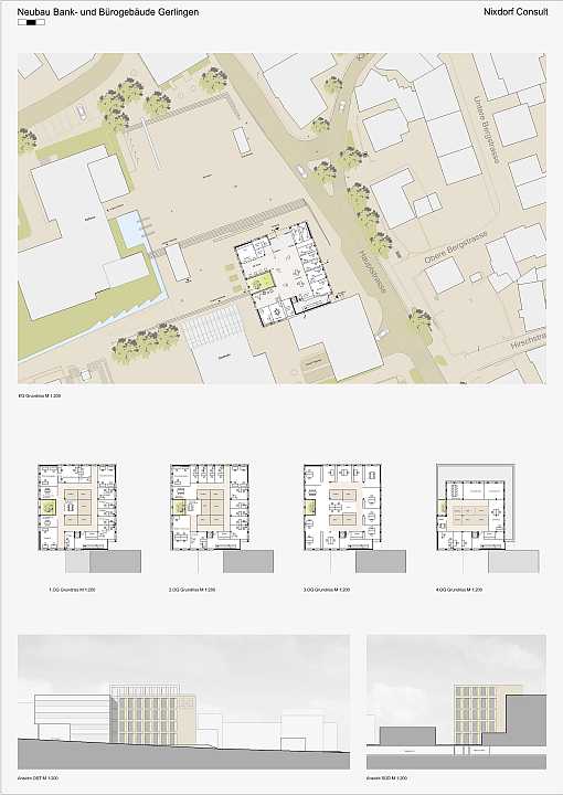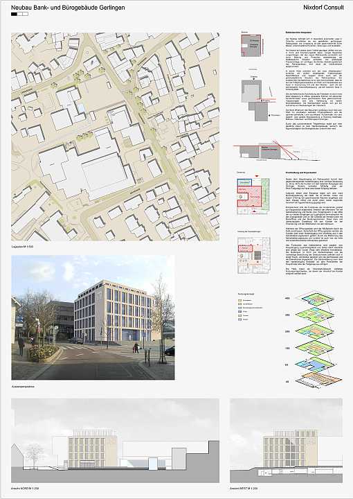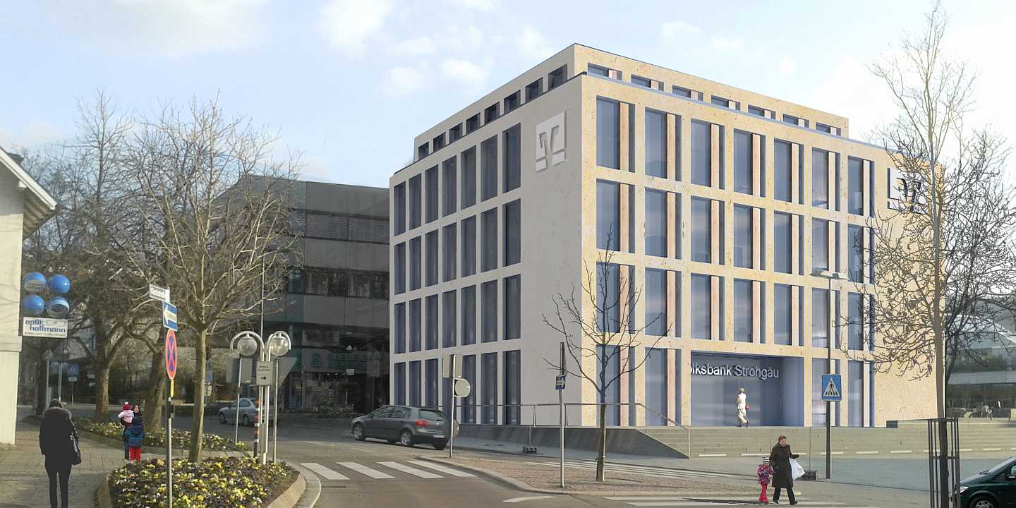 In besonders exponierter Ortskernlage unmittelbar am neugestalteten, großzügigen Rathausplatz war der Neubau eines Bank- und Bürogebäudes zu entwerfen.