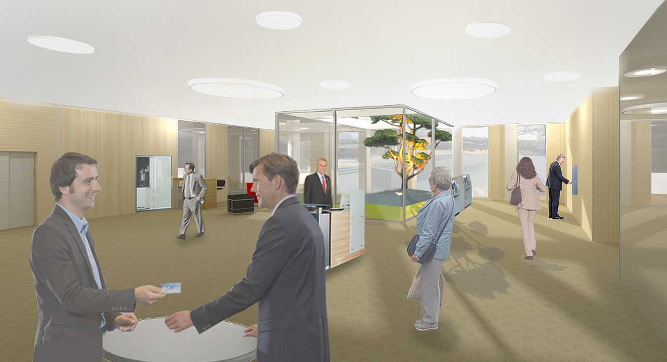 Die Bank öffnet sich dem Besucher großzügig durch den zum Platz hin orientierten zentralen Eingangsbereich mit Licht durchfluteter Kundenhalle. Blickbeziehungen in Richtung Stadthalle, Rathaus, Hallenbad und Bildungseinrichtungen sind gegeben. Ein heller begrünter Innenhof mit Tageslichteintrag trägt zu einer angenehmen Atmosphäre bei.