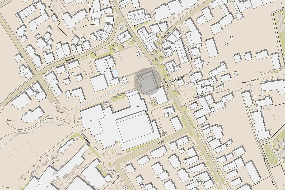 In seiner Höhe orientiert sich der neue „Stadtbaustein“ zunächst am südlich angelagerten 4-geschossigen Geschäftshaus und reagiert damit auch auf die großmaßstäbliche Situation des Rathausplatzes. Ein zusätzliches Dachgeschoss wurde so weit zurückversetzt, dass es aus der Fußgängerperspektive von Platz und Hauptstraße aus kaum in Erscheinung tritt und den Neubau auch mit der kleinteiligeren Geschäftsbebauung auf der östlichen Seite in Einklang bringt.