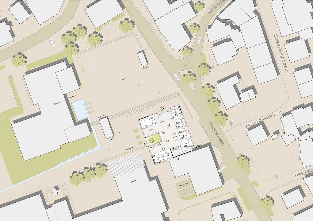 Als Antwort auf das durch Bauten unterschiedlicher Epochen, Nutzungen und Qualitäten geprägte Umfeld, wurde ein in Form und Erscheinungsbild klarer, ruhiger Baukörper vorgeschlagen, der den neuen Rathausplatz einbezieht. Die großzügige Treppenanlage, ein wichtiges räumliches Gestaltungselement des Rathausplatzes, wurde dabei als Gebäudebasis aufgenommen.