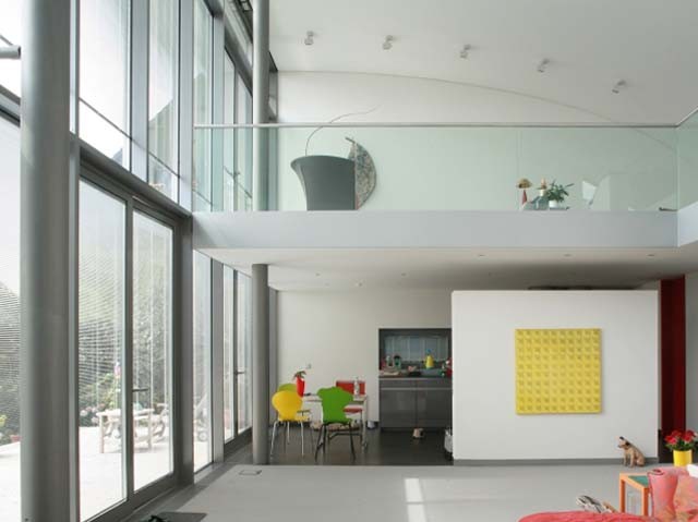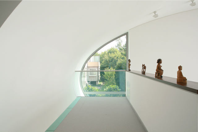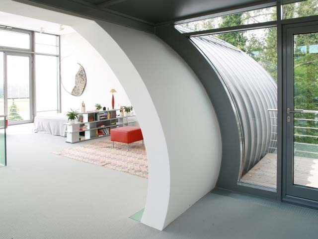 Der südliche Baukörper enthält den 2-geschossigen Wohnbereich mit Galerieebene und offener Küche und wurde zur Südseite hin vollflächig verglast. Die äußere Erscheinungsform dieses Bauteils wird von der ellipsenförmigen Dachschale geprägt, die mit einem silbergrauen Metalldach eingedeckt ist.