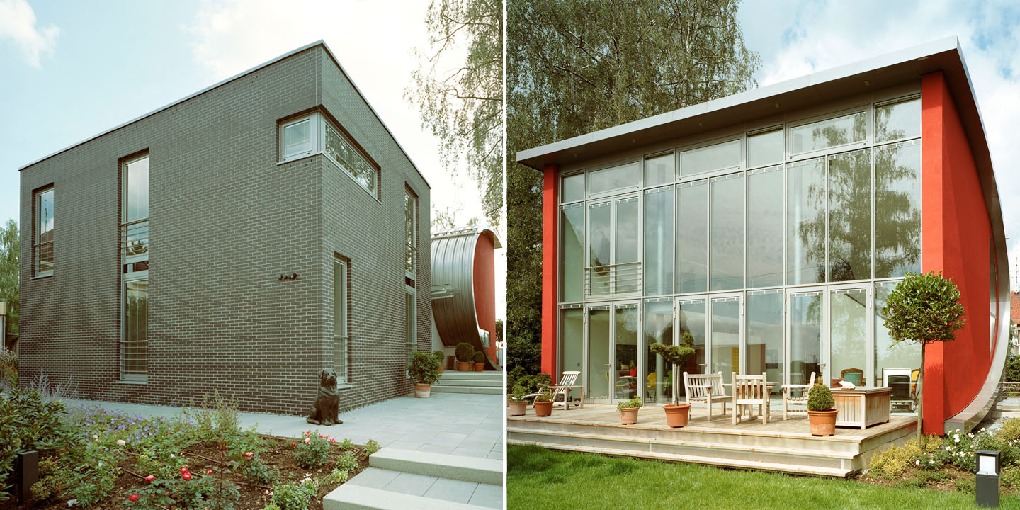 Der nördliche würfelförmige Baukörper mit begrüntem Flachdach kontrastiert hierzu durch sein dunkles Klinkermauerwerk. Hier ist der Schlafbereich untergebracht.